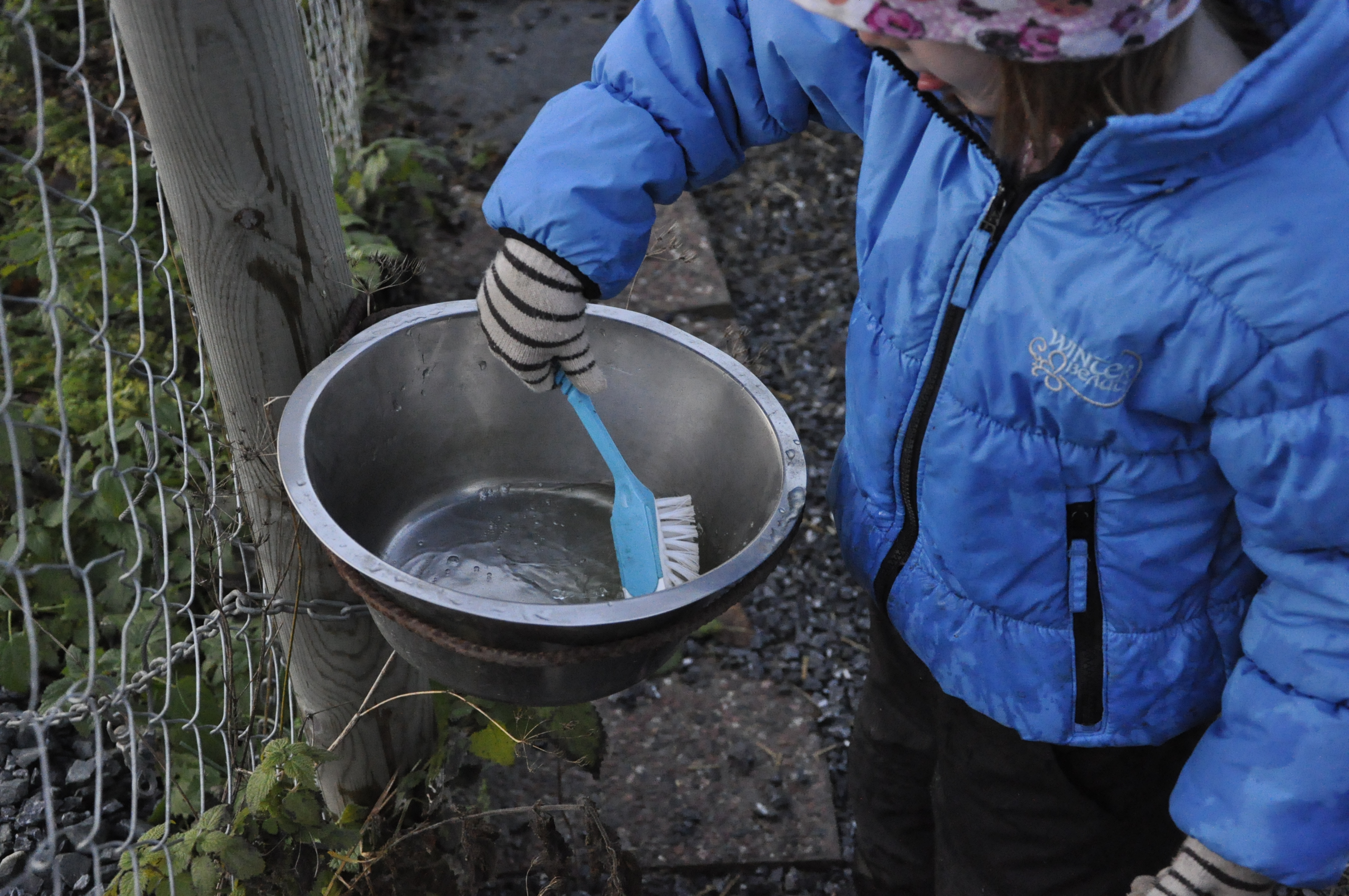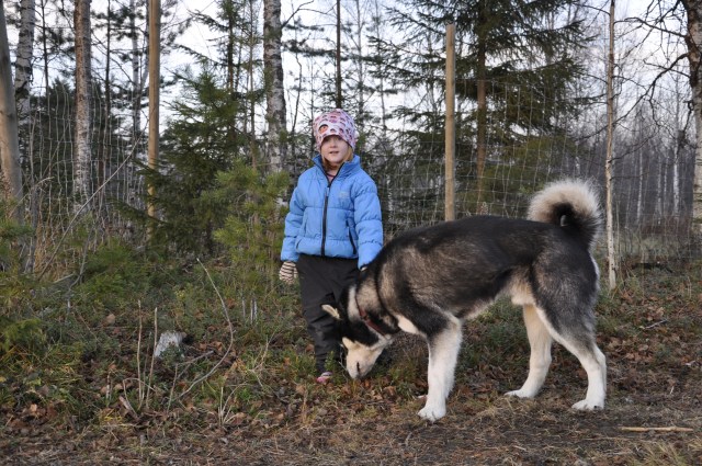 Idag hade jag hjälp av Thea och diska ur alla hundernas vattenskålar, mysigt att gå tillsammans och ordna!Thea är mycket noga när hon gör sakar….Just nu är vi även hundvakt åt Malik, en stor och gosig Alaskan Malamute. Han är utrolig lugn med barnen och det är inga problem för Thea att gå runnt med honom i rastgården.Han fick vare med os i stora rastgården under tiden vi fixade i alla hundgårdarna.