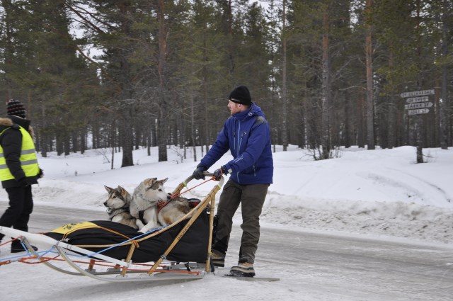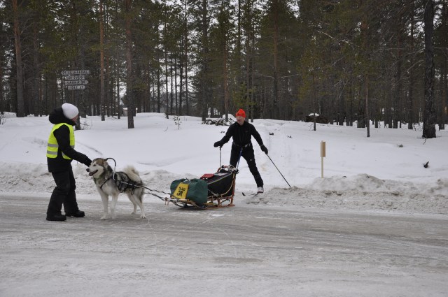Vinnaren av Pulka 300, Leif R. Björneseth ankommer till chp. och får hjälp vid vägövergången.