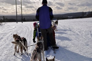 Igår bestämde vi os för att köre en tur med alla hundarna fördelat på två spann och da det är rena skridskobanan hemifrån lastade vi alt i släpet och åkte ca 300 meter till skoterleden starter (ja du läste riktigt). Här lastede vi ur barn, släder, hundar m.m. och startade där ifrån. Ganske ok skoterled, dock lite isig och spårig. Jämtkrafts maskiner hade varit på visit och det gjorde till en balansgång att hålla sig på mitten av spåret, (som i och för sig är precist så bredt som en släde) och inte hamna på sniskan i hjulspåret . Vi hade en fin tur ut till Trångsviken och retur i det härliga solskenet.