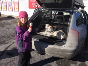 Vi passade på att ta med valparne att de fick åka lite bil och komma sig lite ut i världen, på vägen hem blev det ”glassstopp” vid Ica i Mörsil 🙂