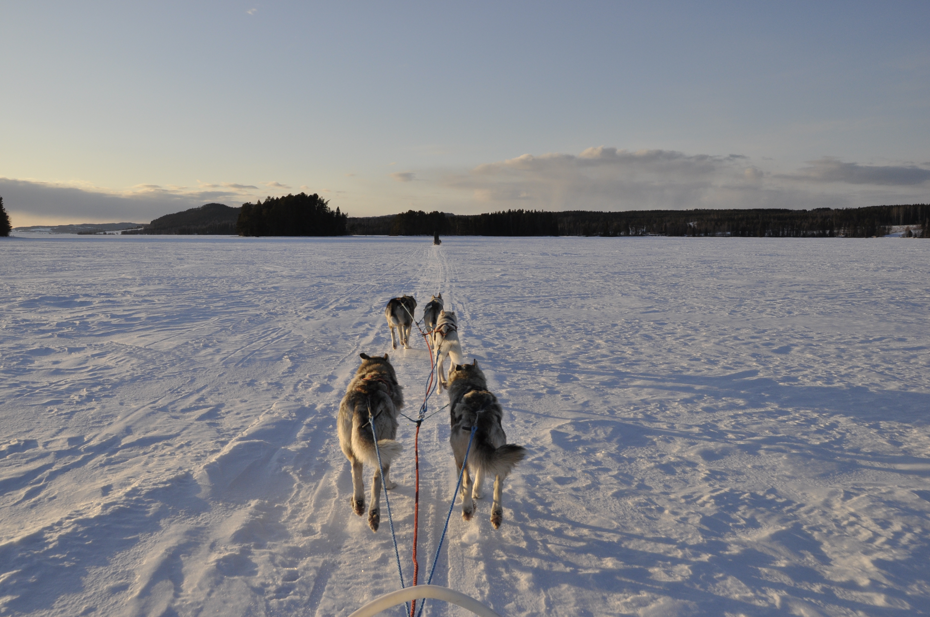 Så här en knapp vecka efter vi ställd om till sommartid märks det att kvällarne har blivit längre och ljusare. I kväll åkte vi hela familjen en sväng på Alsensjön. Isen har varit bra i år och är det fortfarande! Trods att det i veckan har varit på plussidan under dagarna har de kalla nättar set till att spåren direkt från gården fortfarande är bra. Det är första vinteren vi har kunna åka så här sent på säsongen direkt från hundgården!