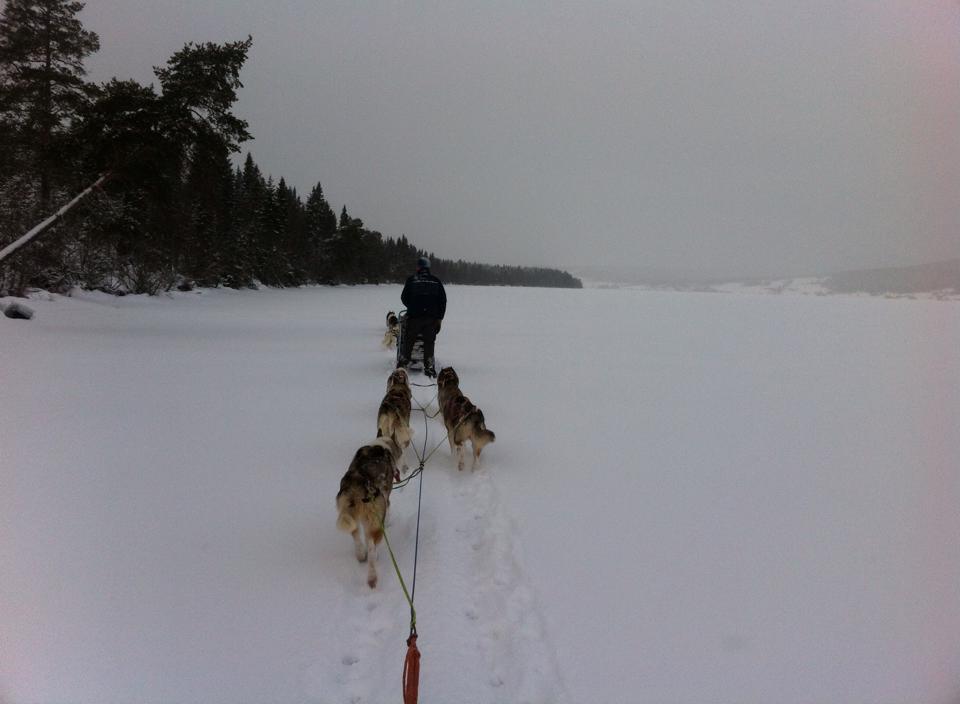 Syftet med besöket i helgen var egentlig att Casper skulle träna på snö da det dåligt med snö i Ytterhogdal där de ligger på träningssemester. Tyvärr hade några av hundarna fått skador på tassarna och måtte vila. I stället hjälpte Casper med att träna våra hundar på lördagen. Jesper skulle ha kört upp spår på sjön nu snön hade kommit även här. Två kalla mil blev det med att lägga första spåret på sjön. Här bild från sjön med Jesper fram för Casper.