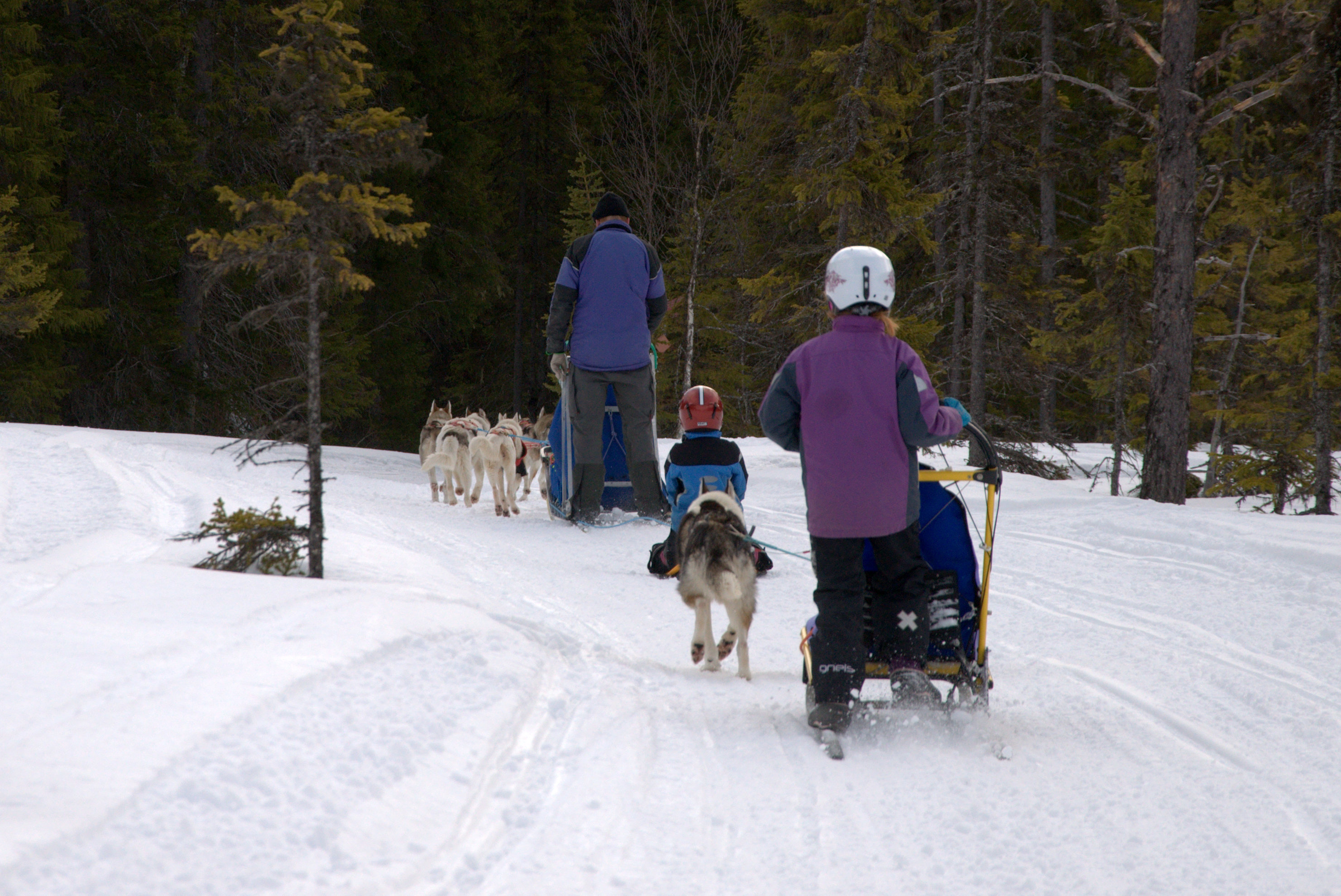 Väl tillbaka vid campingen skulle tjejerna prova på och åka med 1 hund, Emilie på skidor och Thea med Snowracern. Emilie åkte rundan vid campingen (ca 200 meter) efter Paprika i full fart och rätt efter kom Thea på Snowracern med Brono. Båda tyckte det var riktig kul!