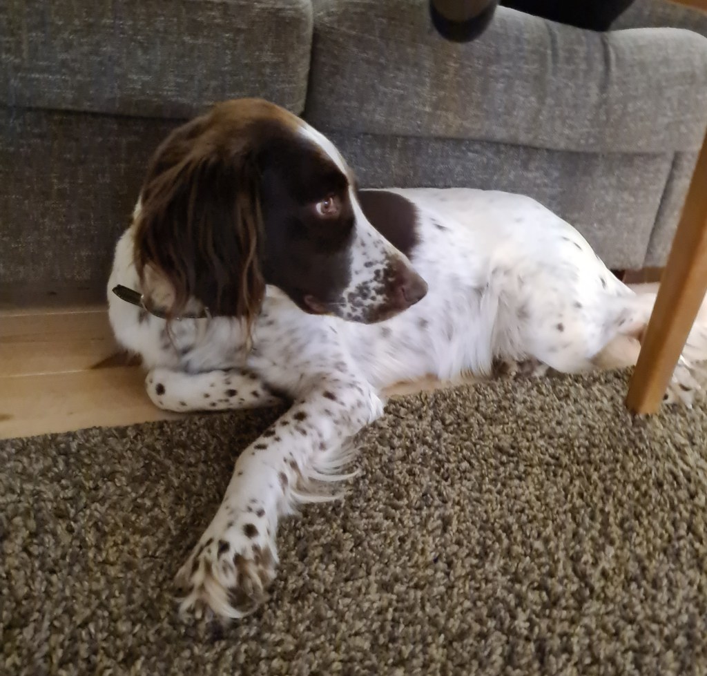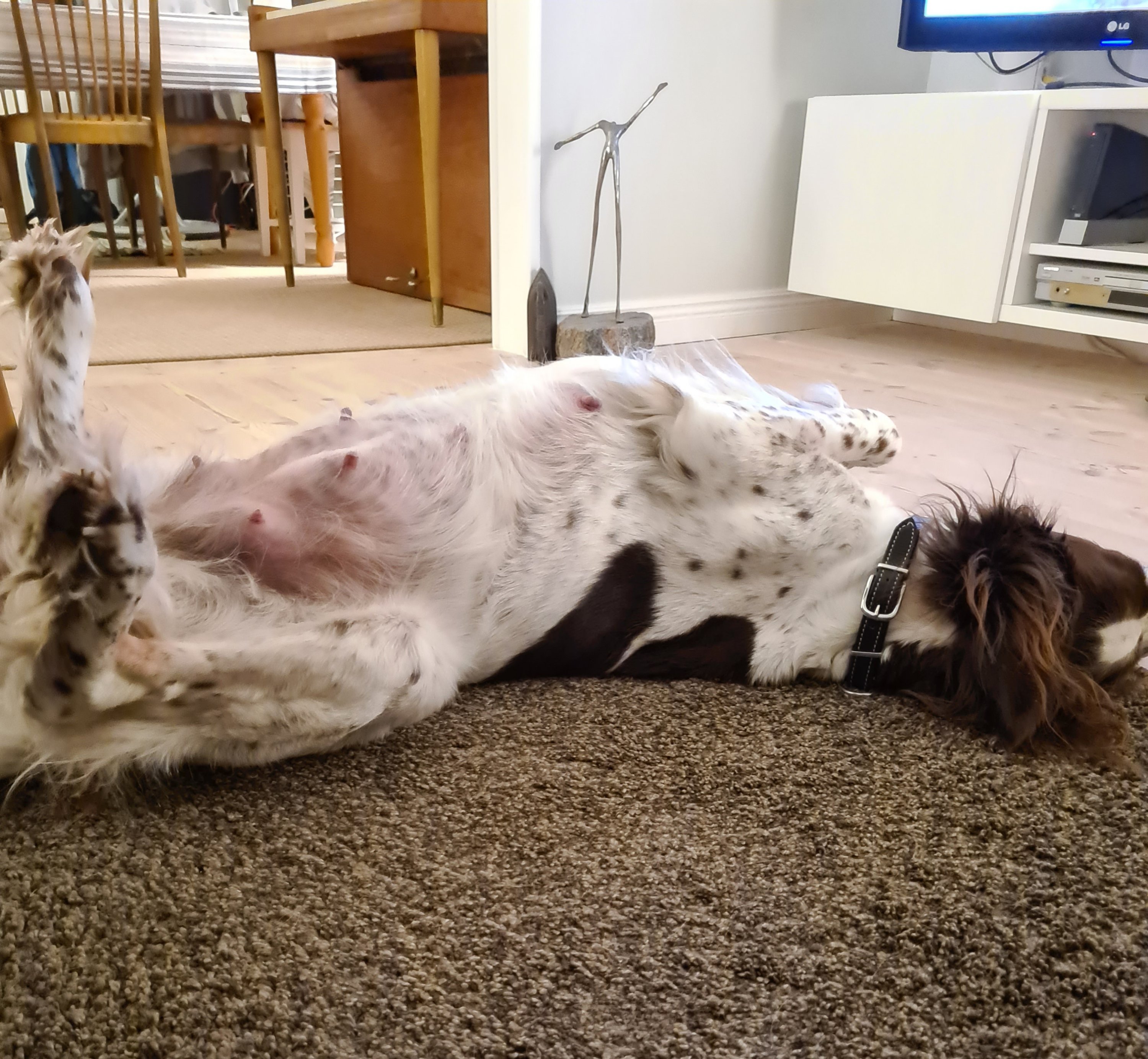 Dålig aptit har avlöst av väldig mycket aptit och ständigt matfokus 😅 Vi har börja öka på lite så hon håller lagom hull fram till valpning sen blir det mer eller mindre fri tillgång.