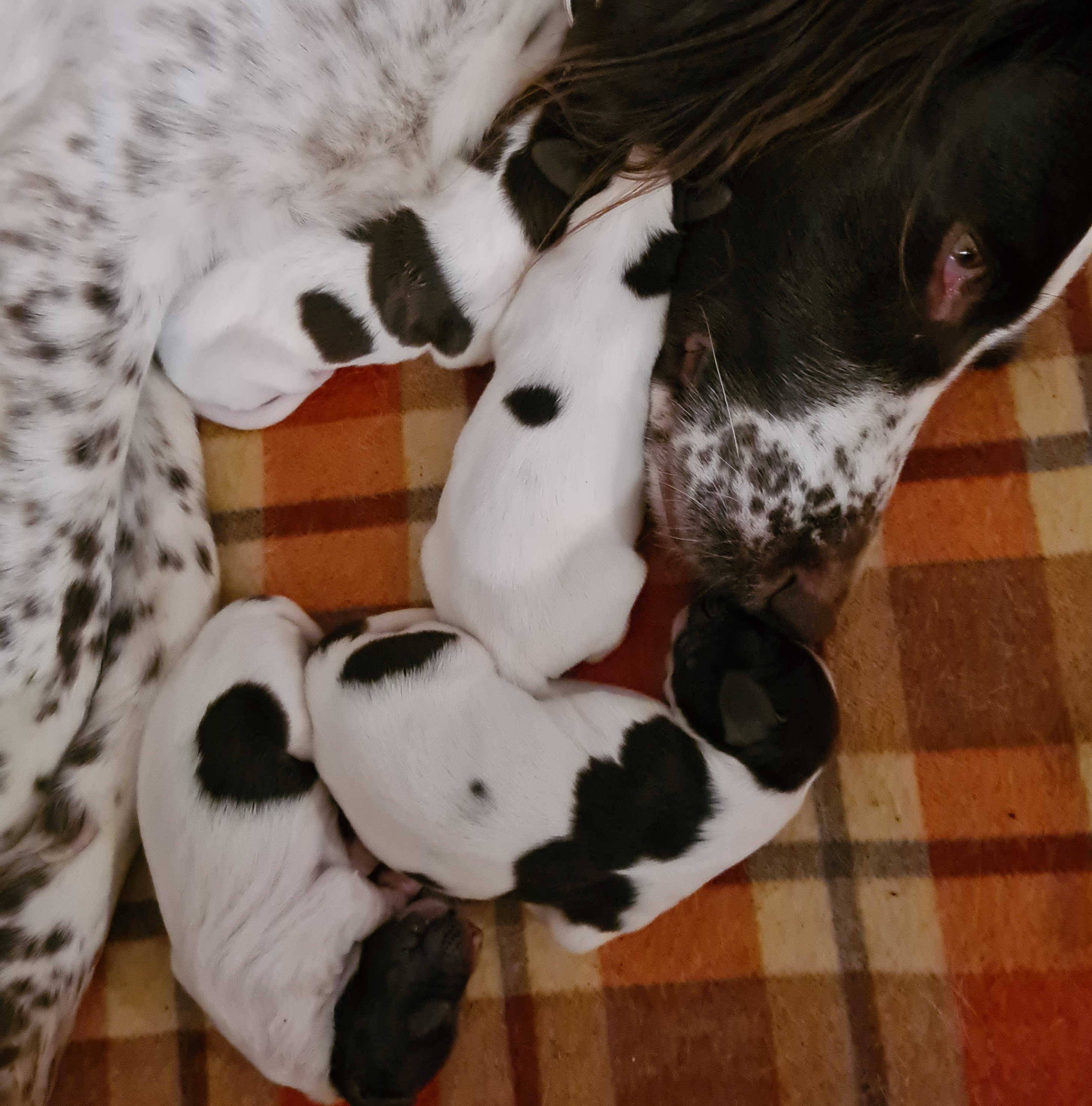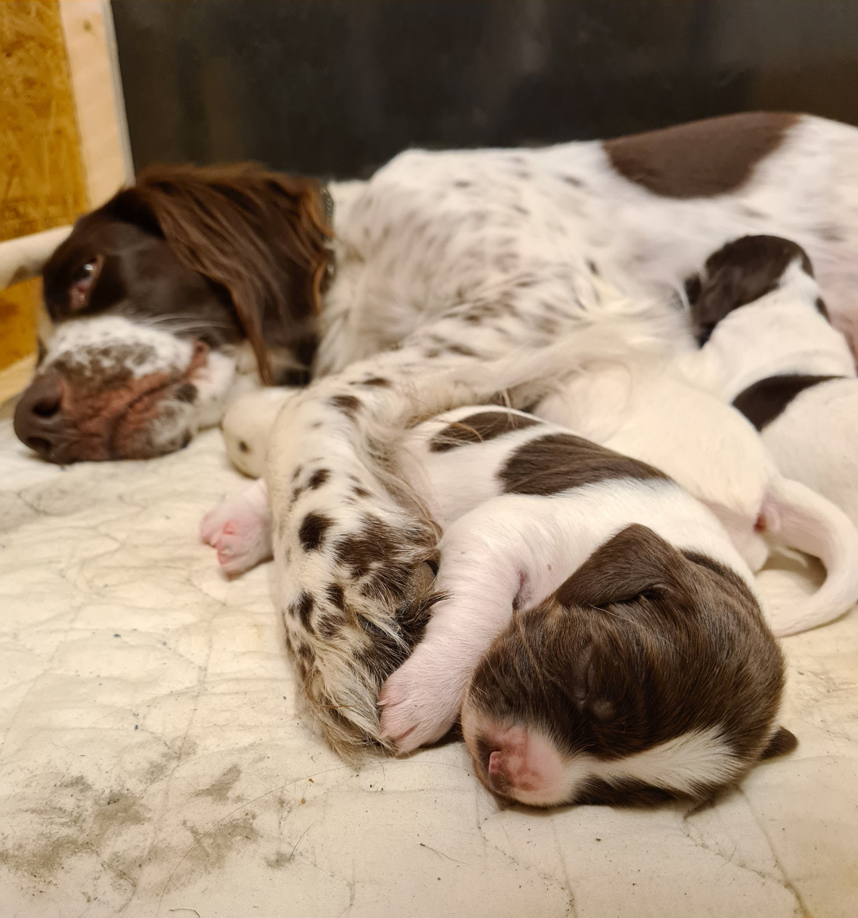 Naja skötte det mesta själv och gjorde ren valparna. Jag (Helle) var med och hållt lite koll när de kom ut, när Naja stökade runt i lådan och hjalp dom till juvern för en första tår mjölk.
